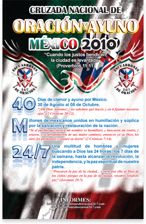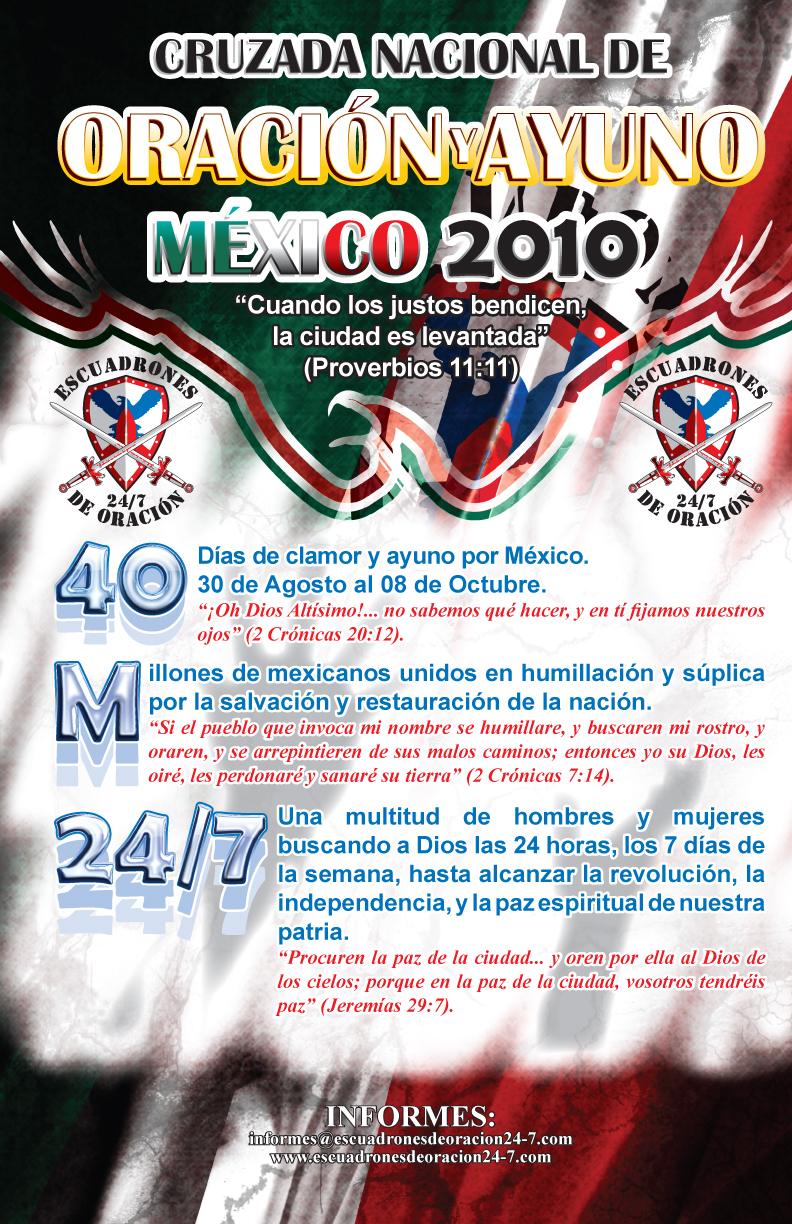 2. Cruzada Nacional de Oración y Ayuno México 2010. 40 días de clamor y ayuno por México del 30 de Agosto al 08 de Octubre de 2010. Desde aquí puedes descargar la publicidad del evento para poder imprimirlo y darlo a conocer en tu ciudad.